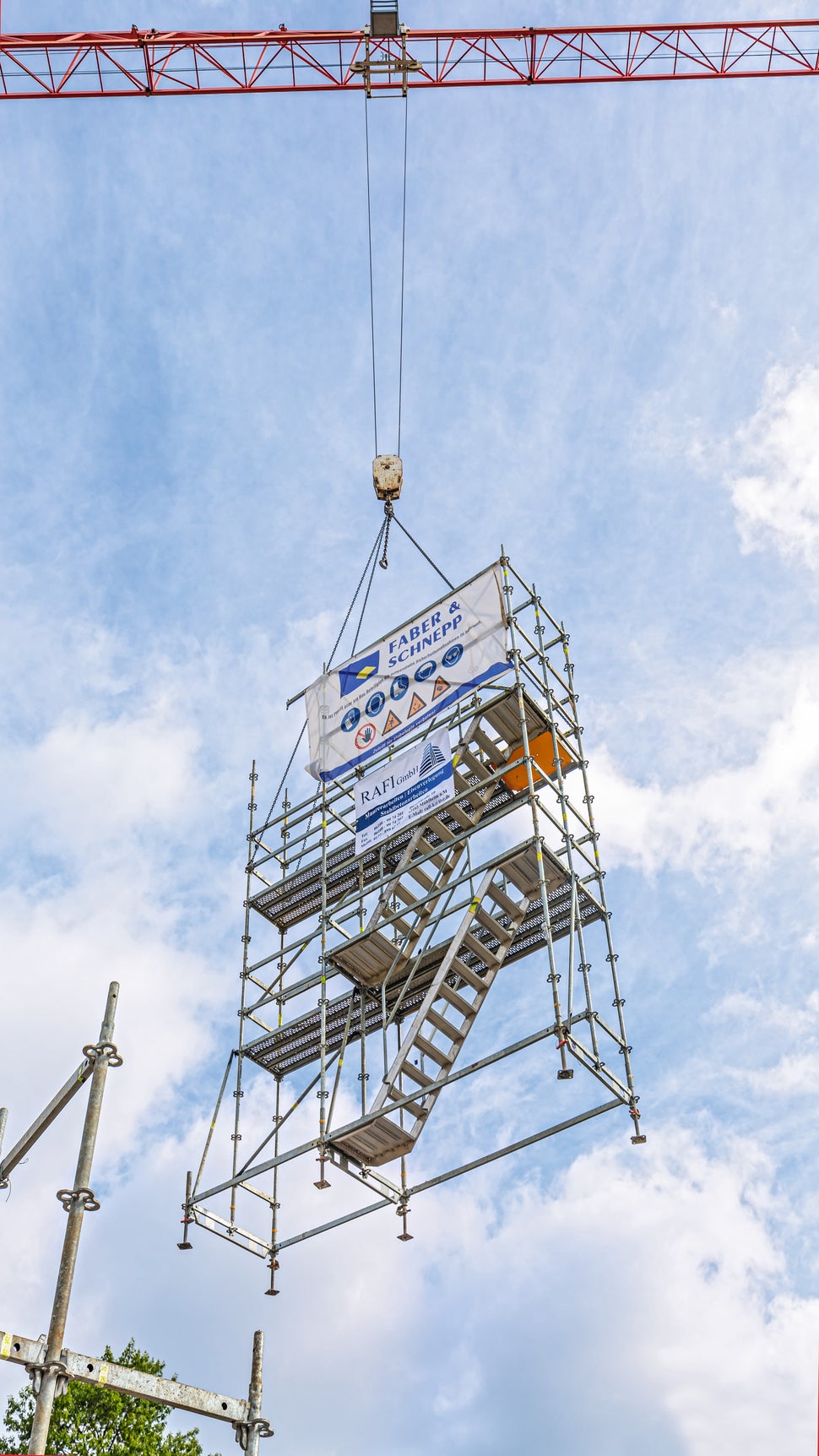 Auch die über 10 m hohen Bewehrungsgerüste können mit dem Kran an die richtige Position gesetzt werden.