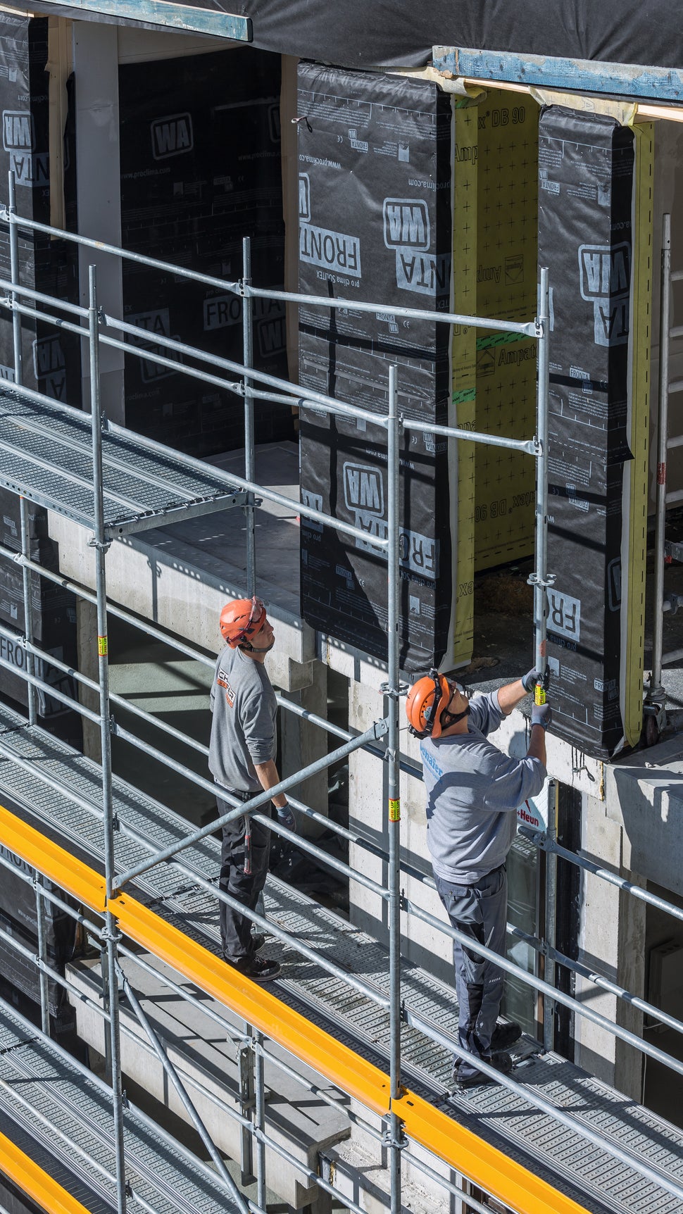 Das Fassadengerüst bietet Sicherheit im System, denn das Geländer für die nächste Ebene wird mit dem Easy Stiel bzw. dem Easy Rahmen ohne Zusatzbauteile – wie z.B. ein Montageschutzgeländer (MSG) – von der unteren, bereits gesicherten, Gerüstlage aus montiert. -