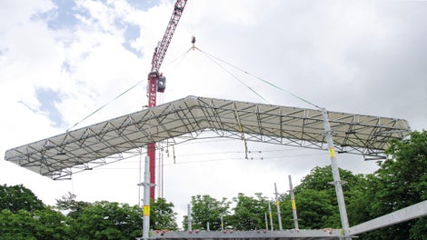 Montieren Sie die Bindereinheiten des PERI UP Wetterschutzdaches schnell und sicher vom Boden aus. Anschließend werden diese mit Hilfe eines Krans in Position gebracht. -