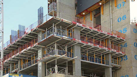 grâce au décoffrage anticipé de la tête de décintrement et au déploiement rapide des panneaux et des poutres à l’étage suivant.