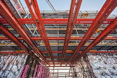 Mit VARIOKIT Systembauteilen lassen sich wirtschaftliche Tunnelschalwagen herstellen, die exakt auf den Bedarf der jeweiligen Baustelle ausgelegt sind. Anforderungen wie Durchfahrtsöffnungen für LKWs oder einhäuptige Wandschalungen werden problemlos erfüllt. Ergänzende Komponenten zum Heben, Senken und Verfahren gehören ebenso zum mietfähigen PERI Portfolio wie sichere Arbeitsplattformen und Zugänge. Arbeitstechnisch notwendiges Zubehör, wie z. B. ein Betonpumpenanschluss, komplettieren die VARIOKIT Lösungen.