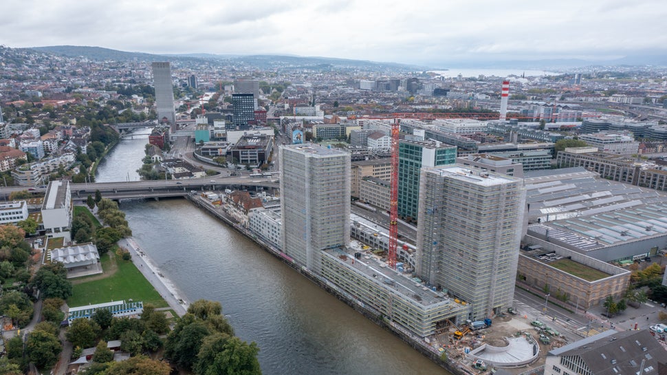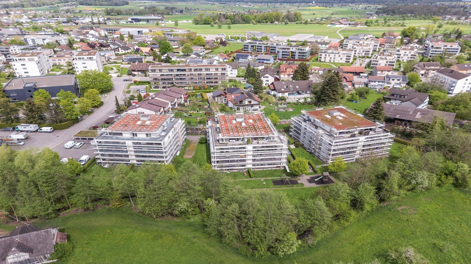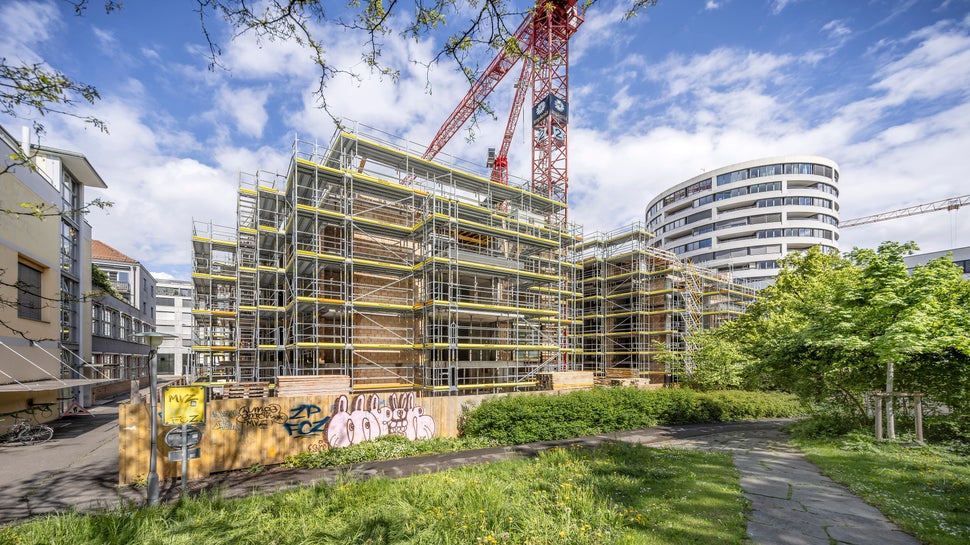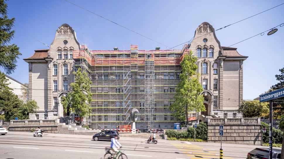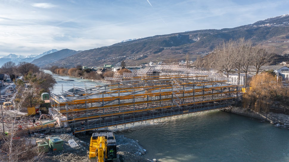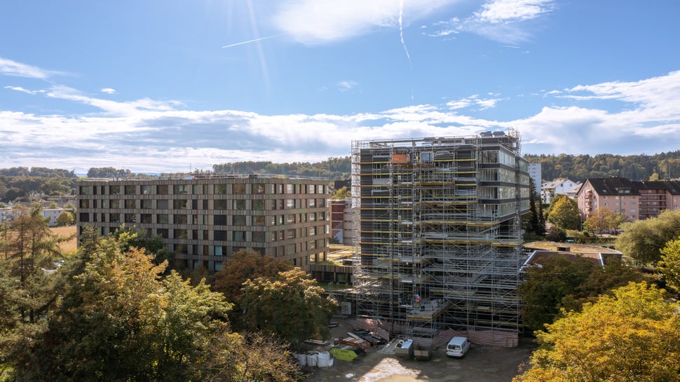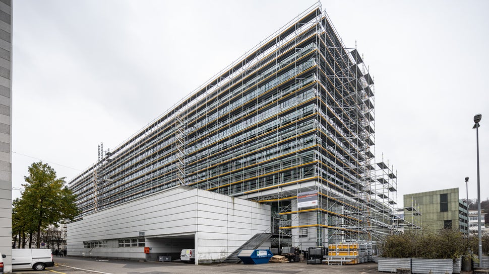 Insgesamt dienen knapp 10.000 m² PERI UP Easy Fassadengerüst zur sicheren Ausführung der Fassaden- und Klinkerarbeiten. Die Arbeitshöhen betragen an den Gebäudeaussenseiten bis zu 22 m.