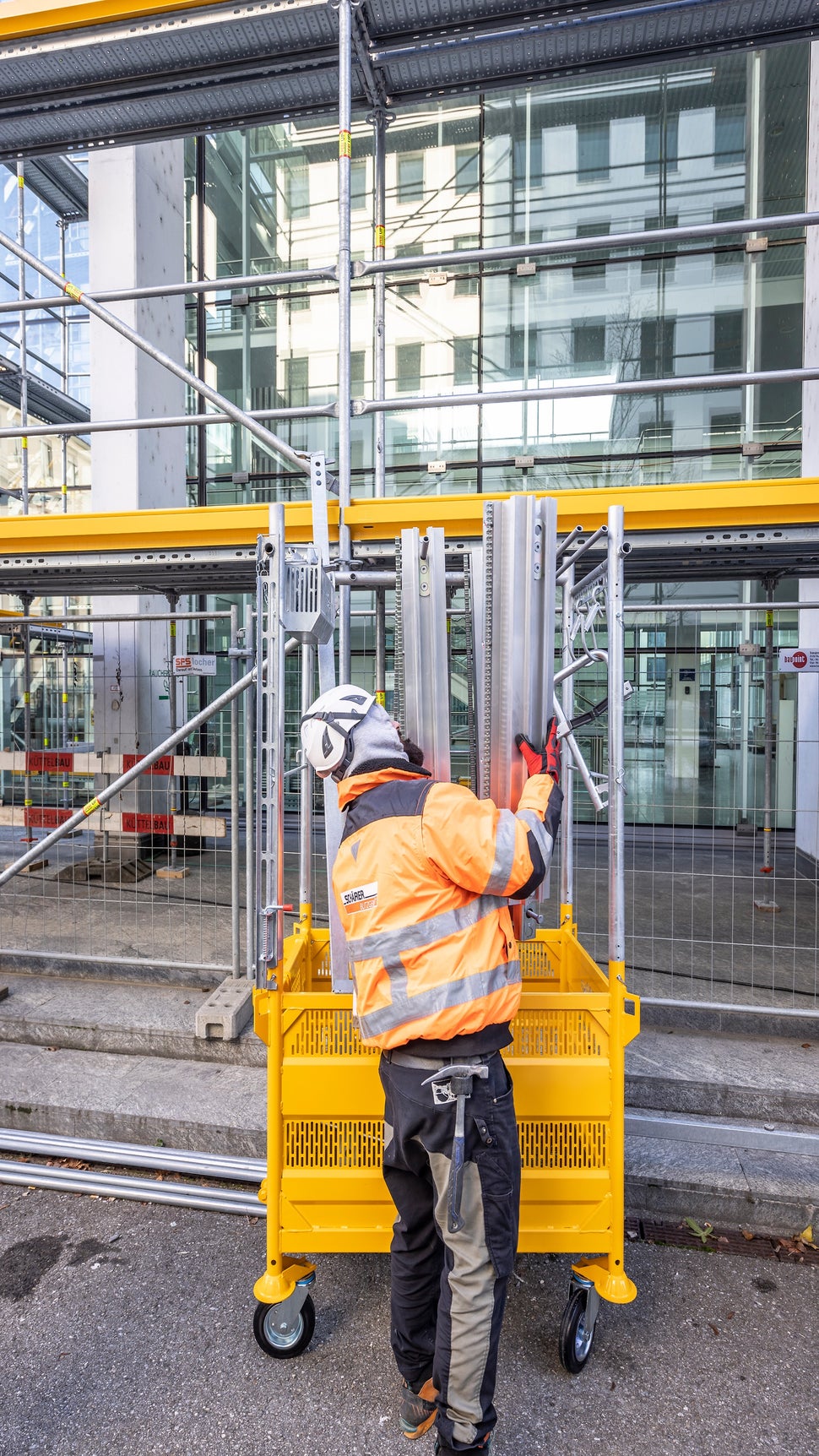 Seguridad sistemáticaCon muchos componentes de seguridad, el sistema ofrece una forma mejorada de trabajar con mayor seguridad. La combinación del andamio PERI UP y STS 300 garantiza que los andamistas trabajen siempre en una posición segura, en línea con las últimas normativas.
