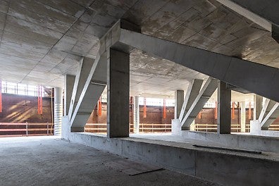 Das Sprengwerk innerhalb der zweiten Etage sorgt für die geforderte Stützenfreiheit im darunterliegenden Konferenzsaal.