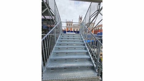 Solución para una feria comercial: escalera de acceso a una pasarela peatonal, que cruza una carretera de varios carriles.