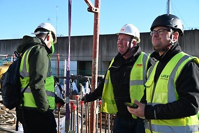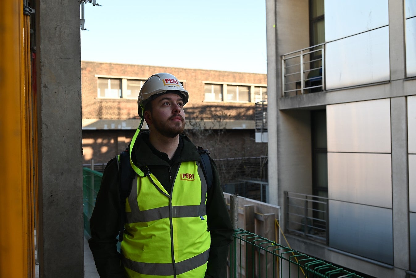 Equally, space inside the core was limited. Using flexible PERI UP scaffolding components to create an access system has ensured the available space is fully utilised from the bottom of the core all the way up to the working levels, with the option to adapt throughout.