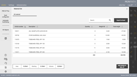 La lista de materiales de la herramienta ofrece una rápida visión general de los artículos previstos, incluidos los detalles de peso, y puede exportarse fácilmente a Excel para preparar presupuestos.