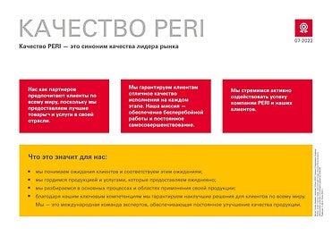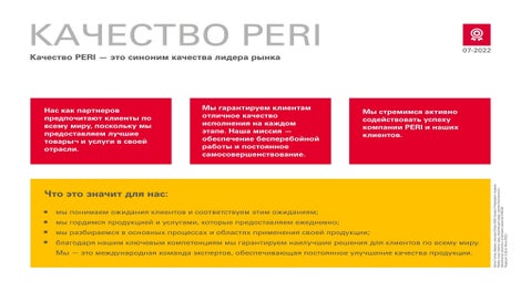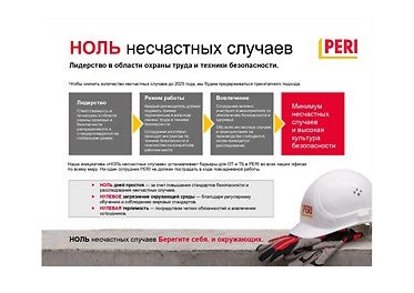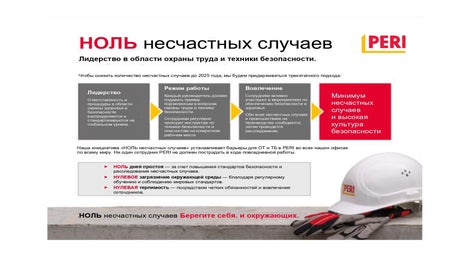Наши ценности и факторы успеха— вот основные принципы нашей деятельности. Девиз нашей компании звучит так: «Мы делаем строительство более эффективным, быстрым и безопасным». Поэтому безопасность и охрана труда являются наивысшим приоритетом для PERI.