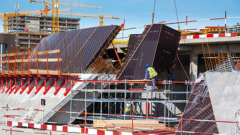 Für jeden Bauabschnitt entwarfen unsere Ingenieure eine speziell auf die sich verändernde Bauwerksgeometrie angepasste 3D-Schalung. Sie war Voraussetzung, um eine effiziente Lösung für die Bauwerksradien der Stahlbetonwände inklusive der sich in der Stärke ändernden Unterzüge zu entwickeln. Das Ergebnis waren unterschiedliche, maßgeschneiderte 3D-Sonderschalungselemente auf Basis der VARIO GT 24 Träger-Wandschalung. Damit konnten sowohl die rundgeneigten Wände als auch die Unterzüge parallel geschalt werden.