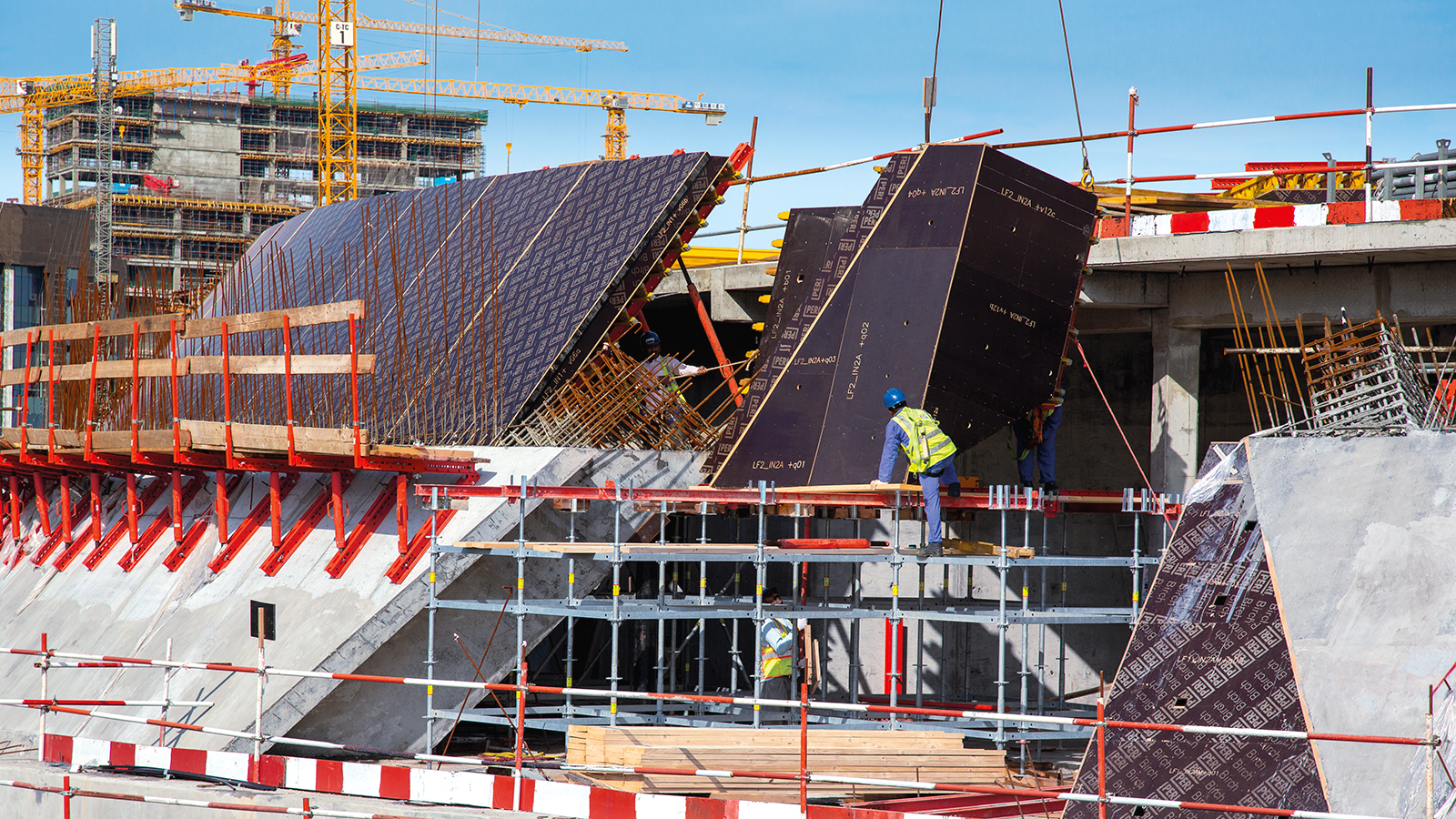 Ab dem zweiten Abschnitt wurden die Schalungssysteme um Bauteile des PERI UP Gerüstbaukastens ergänzt. Da unsere Schalungen und Gerüste nahtlos miteinander kombiniert werden können, war es für unsere Ingenieure umso einfacher, auf effiziente Weise ein Schalungskonzept zu entwickeln. Die Symmetrie des Bauwerks machte die Planung noch effizienter, da sie das Konzept für die gesamte Runde nutzen konnten. „Durch dieses Vorgehen haben wir außerdem Baukosten und Planungszeit stark reduzieren können“, erzählt David.